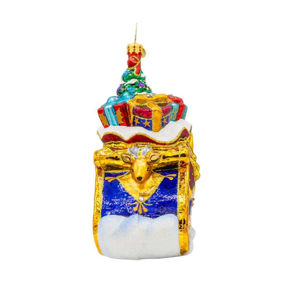 As the sleigh takes flight, a winter wonderland unfolds. Adorned with shimmering jewels and regal ribbons, this celebratory sleighride is a feast for the eyes.