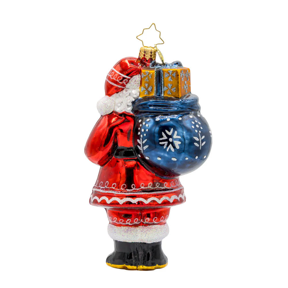 This delightful Folklore Father Christmas ornament is full of whimsical charm. With his folk pattern coat, festive gifts, and joyful expression, he's sure to bring a smile to your face