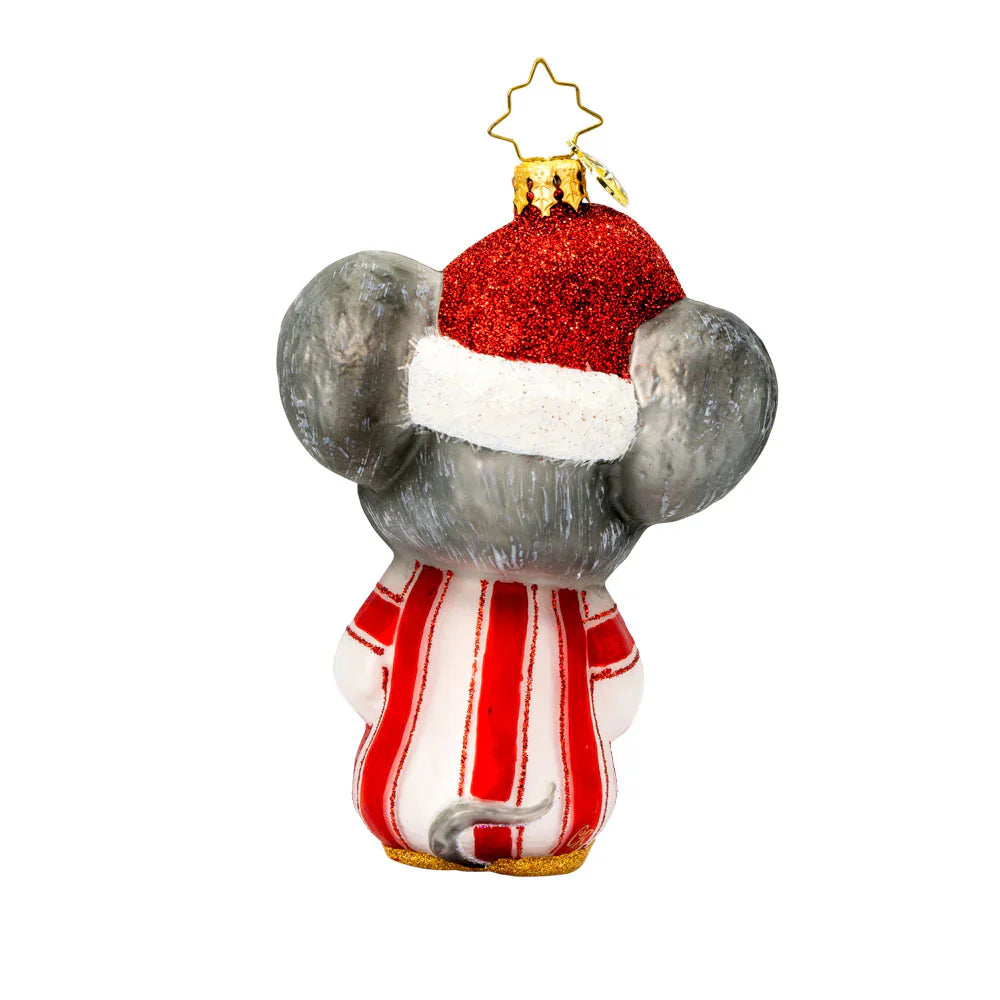 A charming mouse snuggled up in whimsical striped pajamas, complete with a fluffy Santa hat perched jauntily on its tiny head. With its cheerful expression and cozy outfit, this little mouse brings a delightful touch of holiday magic and comfort to your festive decorations