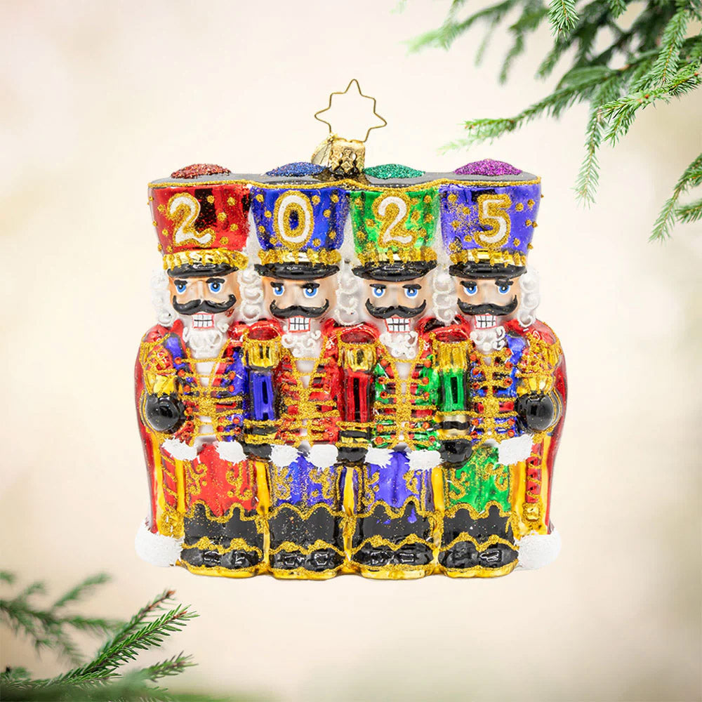 Marching into your heart! This festive ornament features a row of adorable nutcrackers, all dressed in their finest uniforms and ready to march into the New Year. With their shiny hats, sparkling sabers, and colorful costumes, they're sure to bring a smile to your face.