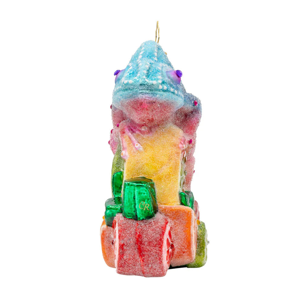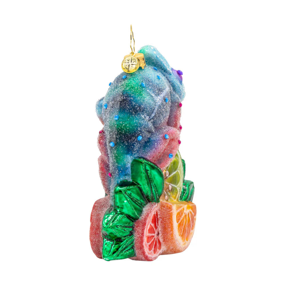 This little chameleon may be a master of disguise, but there’s no hiding its charm! Perched on a vibrant pile of fruit, this ornament is a playful and colorful addition to your holiday décor, perfect for those who love a fun twist on tradition.