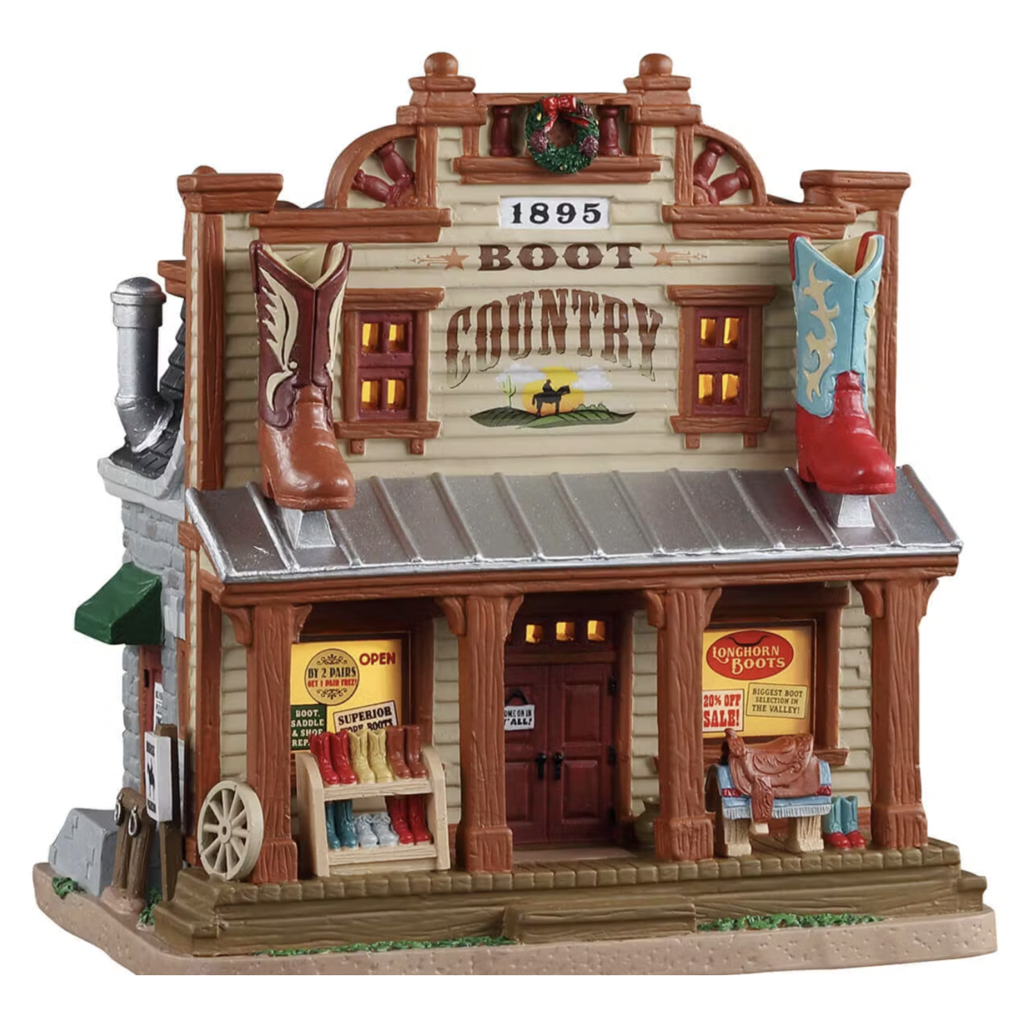 Boot Country is a great place to do some holiday shopping for the cowboys in your life. This typical western-style building has a large porch that's hosting a big saddle and boot sale. Beside the building, there's a horse parking stall next to the stone back portion of the building. The true showpieces are the two oversized cowboy boots hanging on the face of the building.