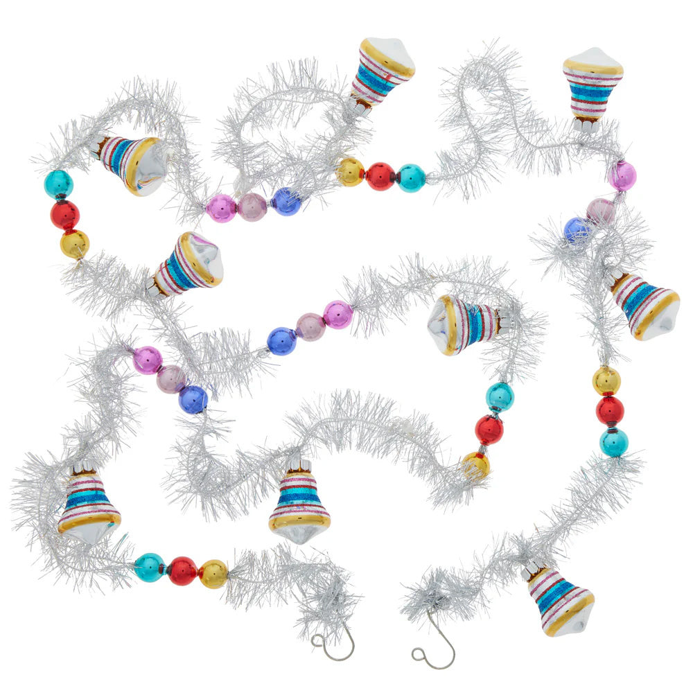 Adorn your tree with this twinkling, tinsel garland accented by classic bell-shaped glass ornaments in vibrant hues.