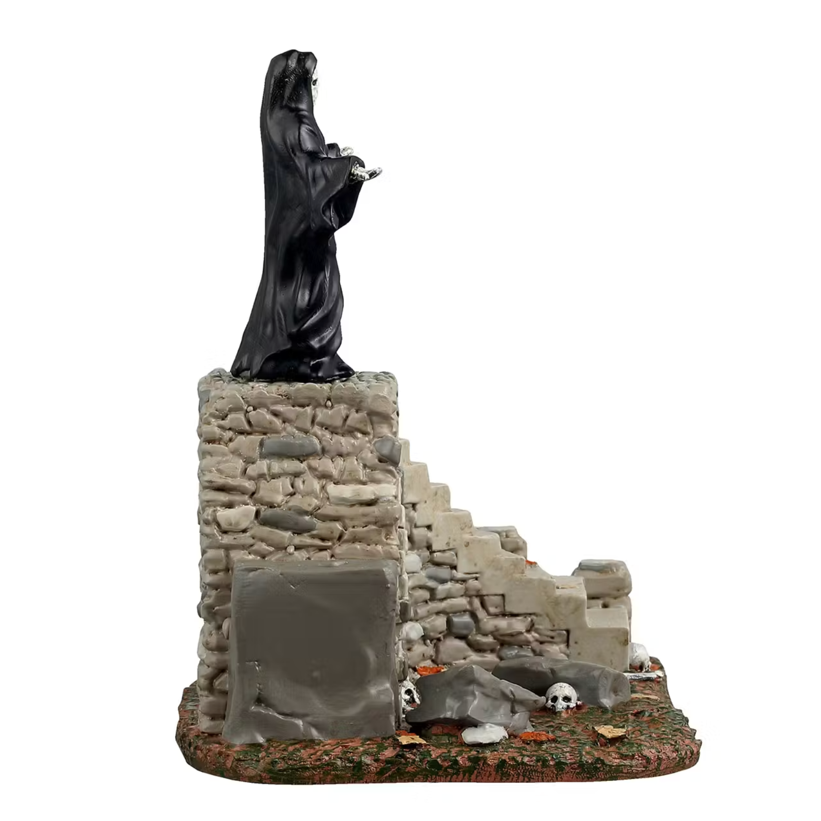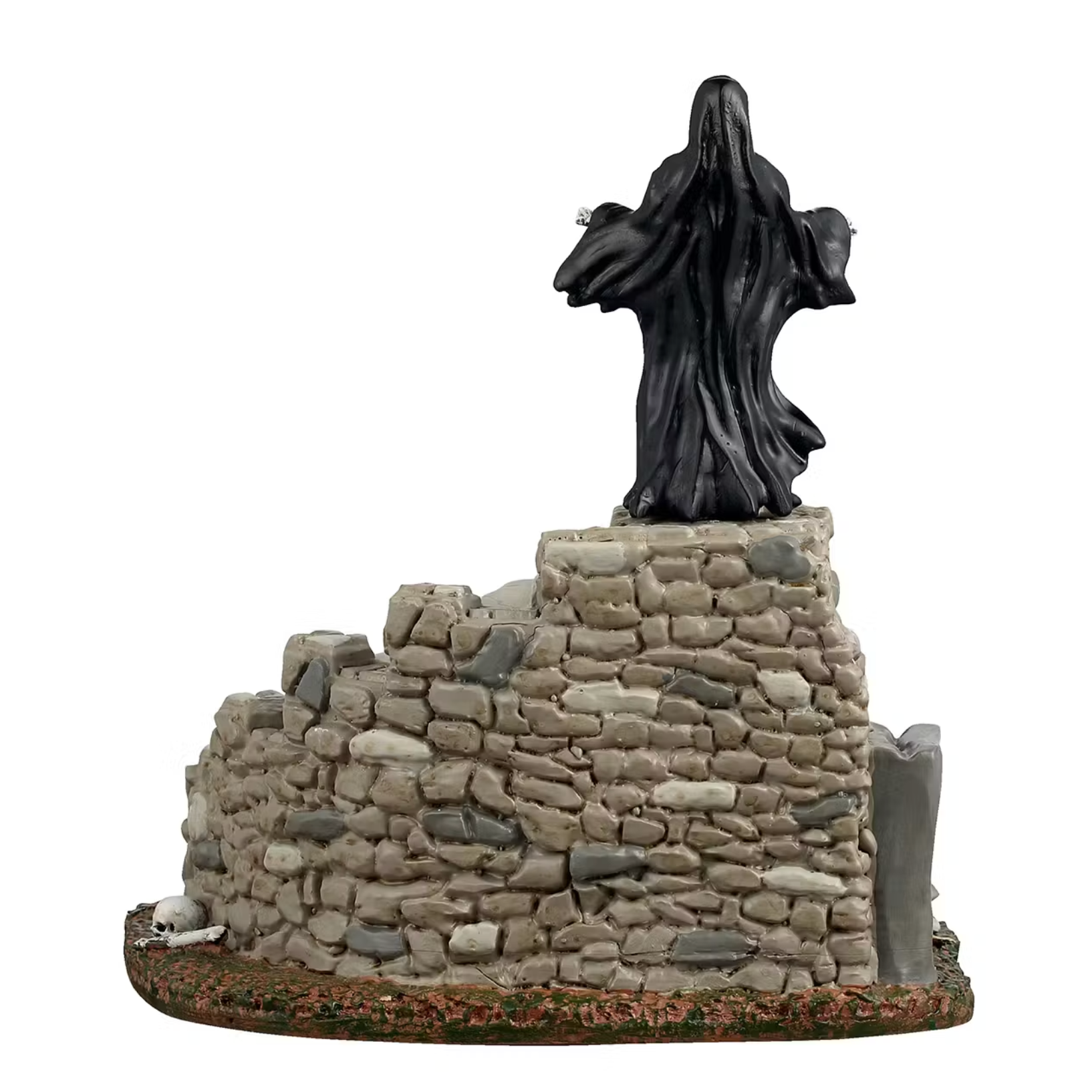 High atop a spooky staircase raunchy with crushed skeletons and skulls, the Grim Reaper emerges. Cloaked in darkness, he stands with an ominous grin and arms stretching out, welcoming all to his ghostly domain. The air grows colder, the silence unnerving, as broken bones crush beneath your feet, a sinister reminder of what happened to those who dared approach him before you.