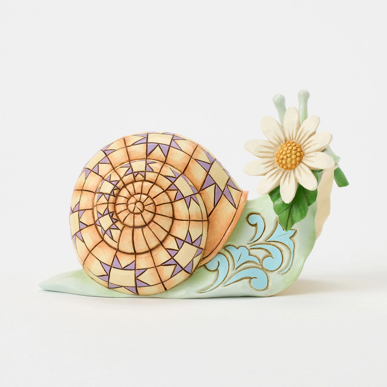 With a patchwork-inspired shell and exquisite rosemaling details, this delightful Jim Shore snail has made a leisurely journey just for you, bringing along a fresh daisy as a springtime token. A charming touch of nature's grace, perfect for any space.