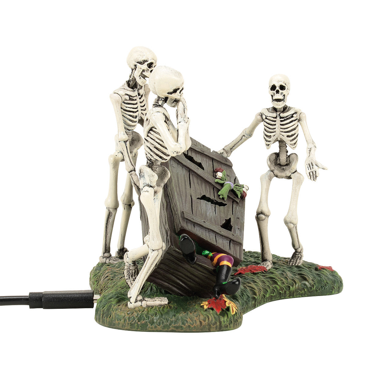 Leave it to her pallbearers to let her down even after she's dead! The old hag's trusted feline watches nearby - unamused - as the skeletons scramble to right the casket and carry their beloved to her final haunting place.