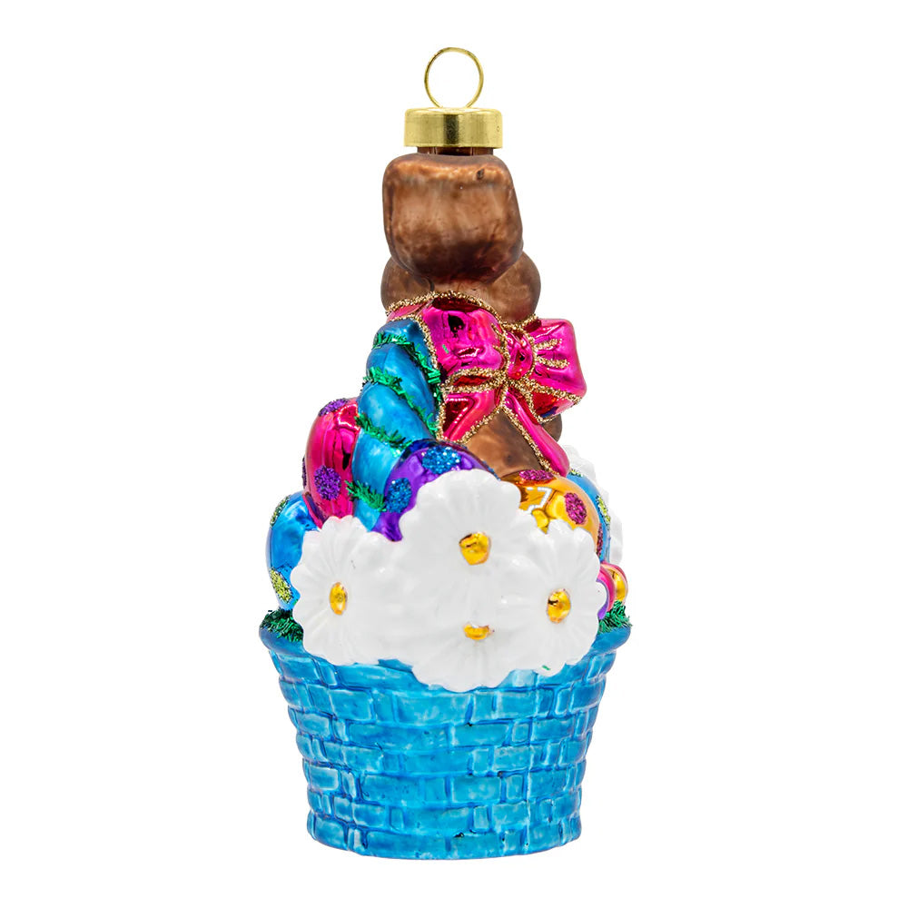 Hop into Easter joy with this delightful basket ornament! Bursting with color, it features a chocolate bunny and eggs, adding whimsical charm to your holiday decor. Egg-cellent Easter fun!