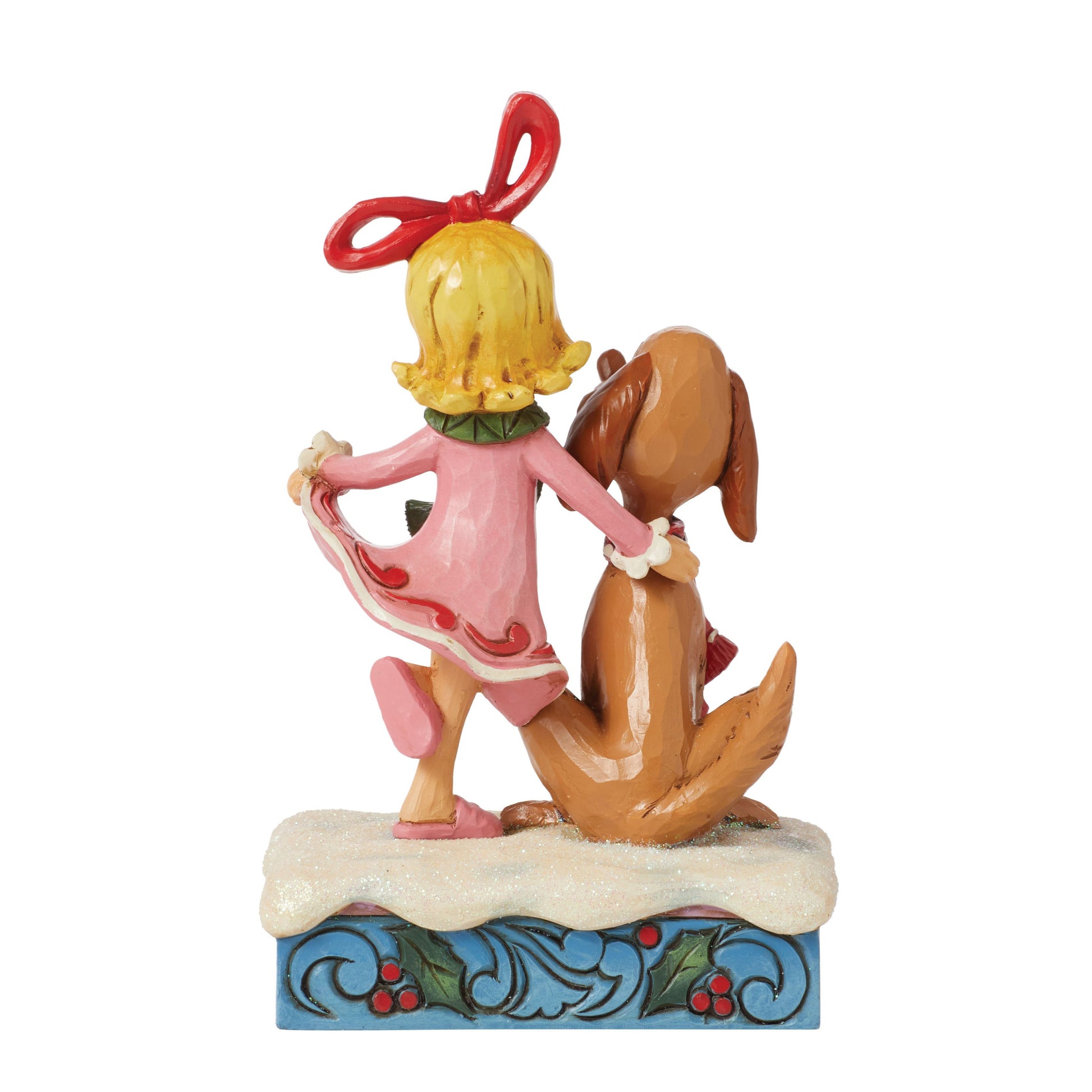 This sweet creation by Jim Shore features Cindy Lou lovingly patting Max the dog. With sweet smiles, the pair might just inspire The Grinch's heart to grow! They wear rosemale details and festive scarves as they sit together in the snow.