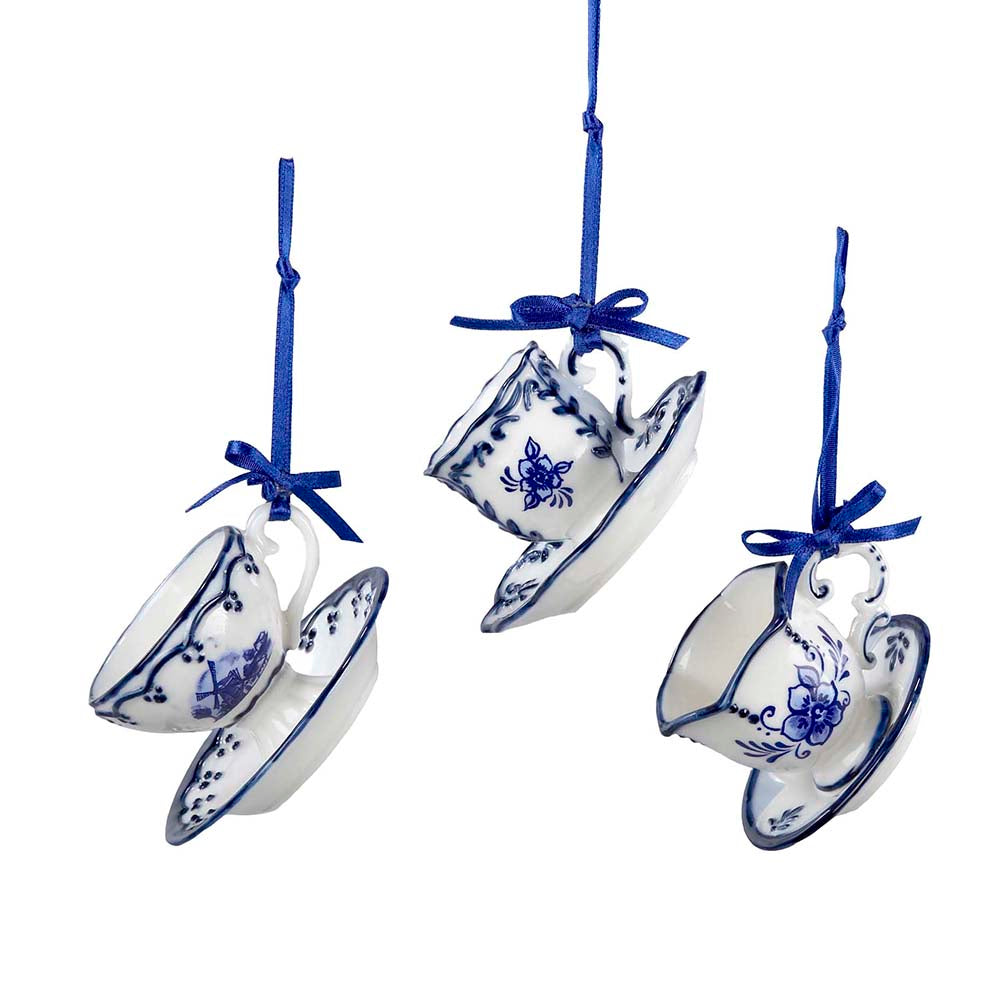 Add an elegant touch to your home décor with these delft blue cup and saucer ornaments from Kurt Adler. This assortment comes with three styled cups, finished off in a beautiful delft blue design. There is a saucer attached at the bottom for each cup.