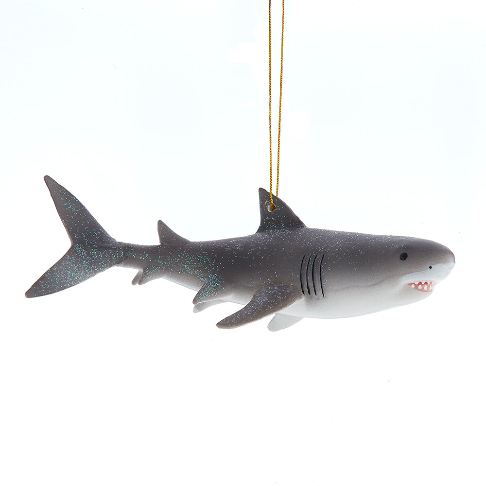 Kurt Adler's Noble Gems™ Glass Great White Shark Ornament is a unique and captivating addition to your holiday decor that brings the wonder of the ocean to your Christmas tree. This extraordinary glass ornament is part of the prestigious Noble Gems™ collection, celebrated for its exceptional craftsmanship and intricate designs. This ornament showcases the artistry of glassblowers and artisans who have expertly created a lifelike representation of this awe-inspiring marine creature. At the core of this ornament is a meticulously crafted glass great white shark figurine, designed to evoke the power and grace of these majestic predators. The shark's detailed glittered features, from its iconic dorsal fin to its striking teeth, are meticulously depicted, making it appear as if it has just emerged from the depths of the ocean. The glass used in this ornament is of the highest quality, hand-painted to ensure accurate and realistic colors that capture the essence of the great white shark. This ornament is not just a decoration; it is a celebration of the beauty and mystery of the sea and the joy of the holiday season. As you hang this ornament and admire its lifelike craftsmanship, you'll be transported to a world of underwater marvels and holiday enchantment. Whether you're decorating your Christmas tree with a marine theme or seeking an exceptional and unexpected gift for an ocean enthusiast, this ornament is an excellent choice. It captures the essence of the holidays with its unique and awe-inspiring design, making it a cherished part of your holiday traditions for years to come.