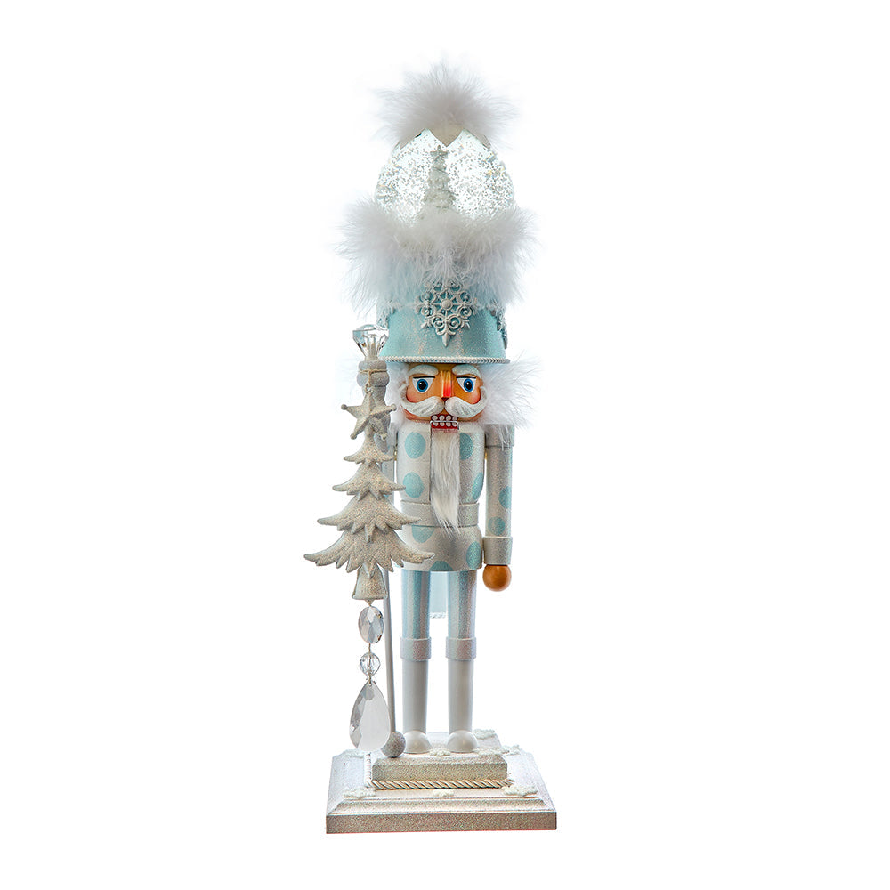 Kurt Adler's 20" Hollywood Nutcrackers™ Battery Operated Lighted Animated Musical White Soldier Water Globes Hat Nutcracker is a grand and captivating holiday decoration that combines multiple delightful features to elevate your festive decor to new heights. Standing at a generous 20 inches in height, this nutcracker figurine is an impressive and attention-grabbing piece. Its design is inspired by the classic toy soldiers and features intricate detailing that includes a crisp white uniform adorned with golden accents. What sets this nutcracker apart is its unique water globe hat – a glass globe filled with water that encases a charming winter scene. Inside the globe, miniature snowflakes swirl around, creating a serene and enchanting atmosphere. This nutcracker is not only a visual masterpiece but also a multi-sensory experience. It's battery-operated and comes to life with enchanting animations and the tune "White Christmas." The soldier's hat, with its water globe feature, lights up with a warm and inviting glow, illuminating the surrounding area. Whether placed by the Christmas tree, on a grand mantelpiece, or as part of a decorative holiday tableau, it is sure to capture the hearts and imaginations of all who see it. This nutcracker is more than just a decoration; it's an interactive holiday experience that engages the senses and evokes the magic of the season. It serves as a cherished centerpiece for your holiday celebrations and is destined to become a beloved part of your festive traditions for years to come.