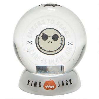 With both engraved elements and delightful decal, this water ball features the pumpkin King at his most dazzling. With the message "Cheers for Fears" and "Scare is in the Air" this snow globe sparkles with mischief and Halloween high jinks.