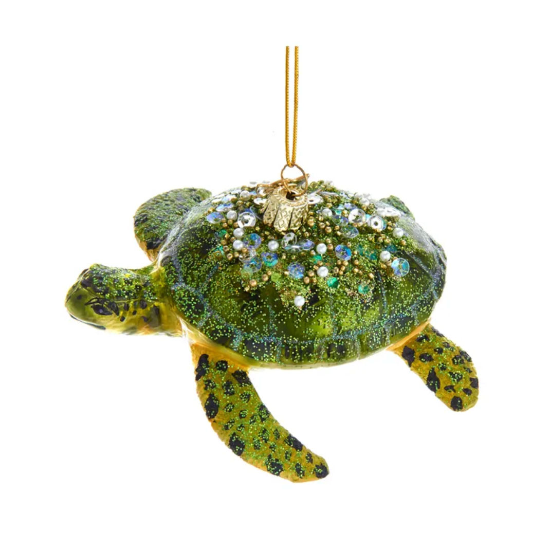 This Noble Gems glass sea turtle ornament is a unique way to add to your holiday décor. This ornament features a realistic design with glittery detailing on the shell and fins.