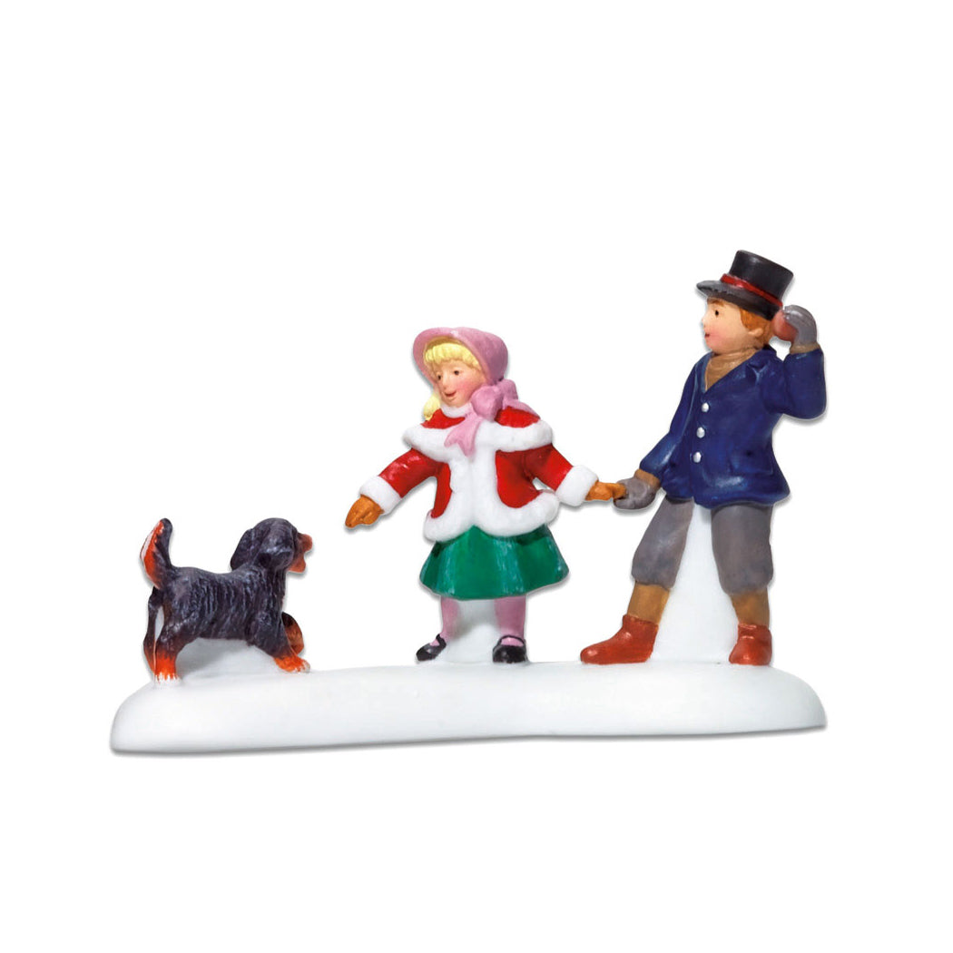 Designed to accompany Dickens Village by Department 56, these children are playing with their new Christmas puppy. Made of porcelain and hand painted. 3 x 1.5 x 2
