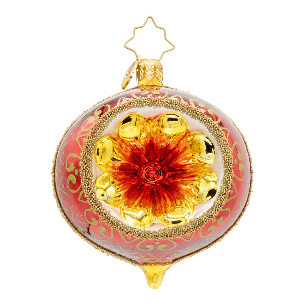 Traditional folk designs of Central European Artists from the 1930’s are the basis of Christopher Radko’s FANTASIA ornaments. A vibrant collection of themes and motifs faithfully translated into lustrous glass decorations. Each blown glass ornament features beautiful handpainted florals on a round with a singluar reflector.