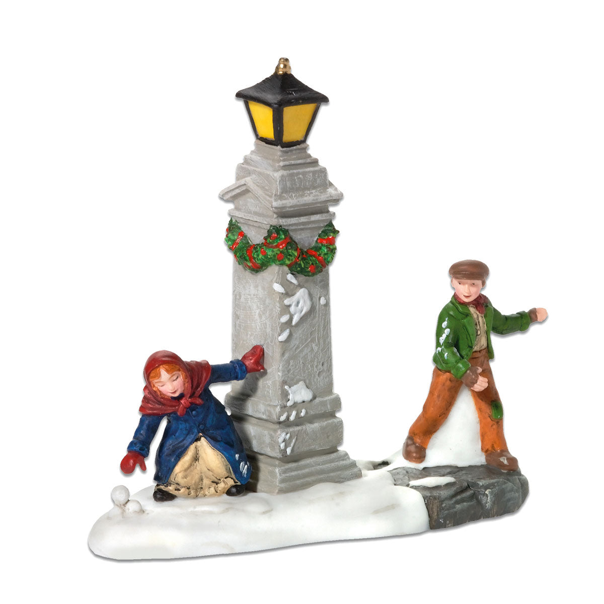 Snow is a more rare occurrence in England, so when it falls, all the children bundle up to go out to enjoy it. The piece is made of porcelain and is hand painted.