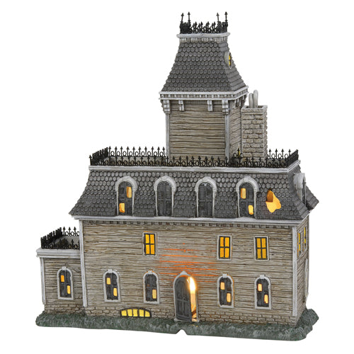 The Department 56 artists captured the perfect rendition of the Family House for The Addams Family, searching a collection of the original cartoons. Highlights include the 4-story central tower, the side observatory, and mansard roof with metal trim. Note the iconic face peeking from the 2nd story window.